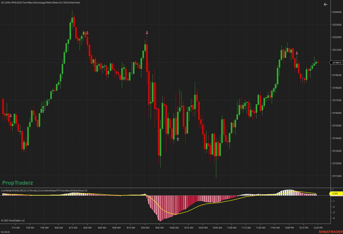 The PropTraderz Cumulative Delta CVOV3 Indicator brings together three powerful forms of volume analysis—OBV, CVD, and PVT—into a single dynamic tool. It translates raw volume data into a clear, actionable view of market participation, showing when aggressive buyers or sellers are dominating, and when pressure begins to shift. Designed for NinjaTrader 8, this indicator was inspired by cumulative delta methodologies originally developed by Igor Zeierman, and re-engineered by PropTraderz to offer flexible visualization, smarter normalization, and full bar-color integration. ⚙️ What It Does At its core, the CVO measures how volume flows through price movement. It helps traders understand who is in control of the market—buyers or sellers—and when…