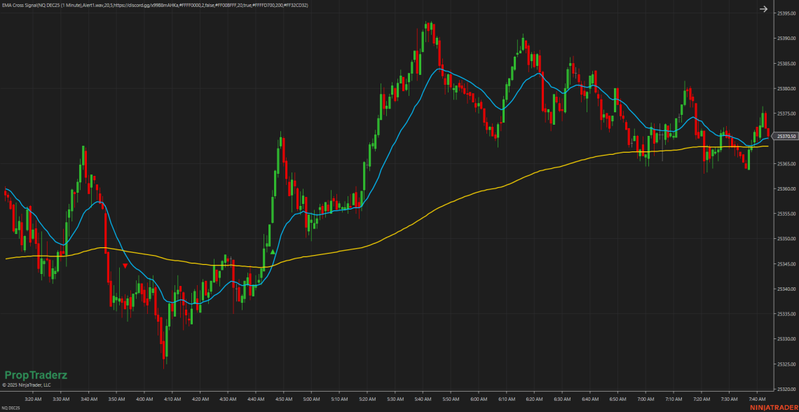 🔥 EMA Cross Signals NinjaTrader indicator by PropTraderz At PropTraderz, we keep things practical — tools that actually help traders. The EMA Cross Arrows indicator was built for those who love simplicity and precision. It’s a lightweight yet powerful indicator that plots two customizable EMAs and draws up and down arrows every time they cross. Whether you’re scalping, day-trading, or swing-trading, EMA crosses remain one of the cleanest visual ways to track short-term momentum shifts. This indicator makes them crystal clear, so you can react quickly and confidently. ⚙️ Key Features Fully customizable EMA periods (set your own fast and slow values) Adjustable colors, line widths, and arrow sizes…