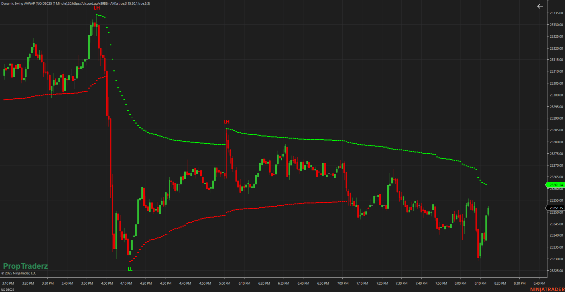 The Idea – Dynamic Swing Anchored VWAP Markets move in legs, not straight lines. Every leg begins where the previous one failed — at a pivot. The Dynamic Swing Anchored VWAP maps that structure directly on your chart by resetting a VWAP (Volume-Weighted Average Price) from each confirmed swing high or swing low. Instead of a single running VWAP that smears trend changes, this version anchors locally — one calculation per leg — letting you see where real accumulation and distribution happen. It’s like watching institutions reload each swing. How It Works Each time price forms a new pivot (HH, HL, LH, LL), the indicator: Detects the swing using your…